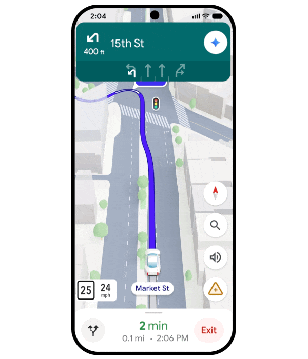 Pela primeira vez, o Google Maps ganha vida com uma visualização 3D vibrante que reflete os edifícios, viadutos e paisagens ao seu redor. Quando útil, o Maps destaca detalhes críticos da estrada, como faixas, faixas de pedestres, semáforos e sinais de parada, para ajudá-lo a virar ou entrar com confiança.