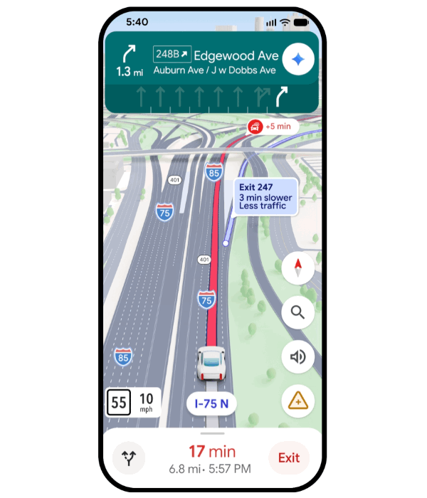 O Google Maps sinaliza alternativas sugeridas enquanto você dirige para que você possa tomar decisões em tempo real