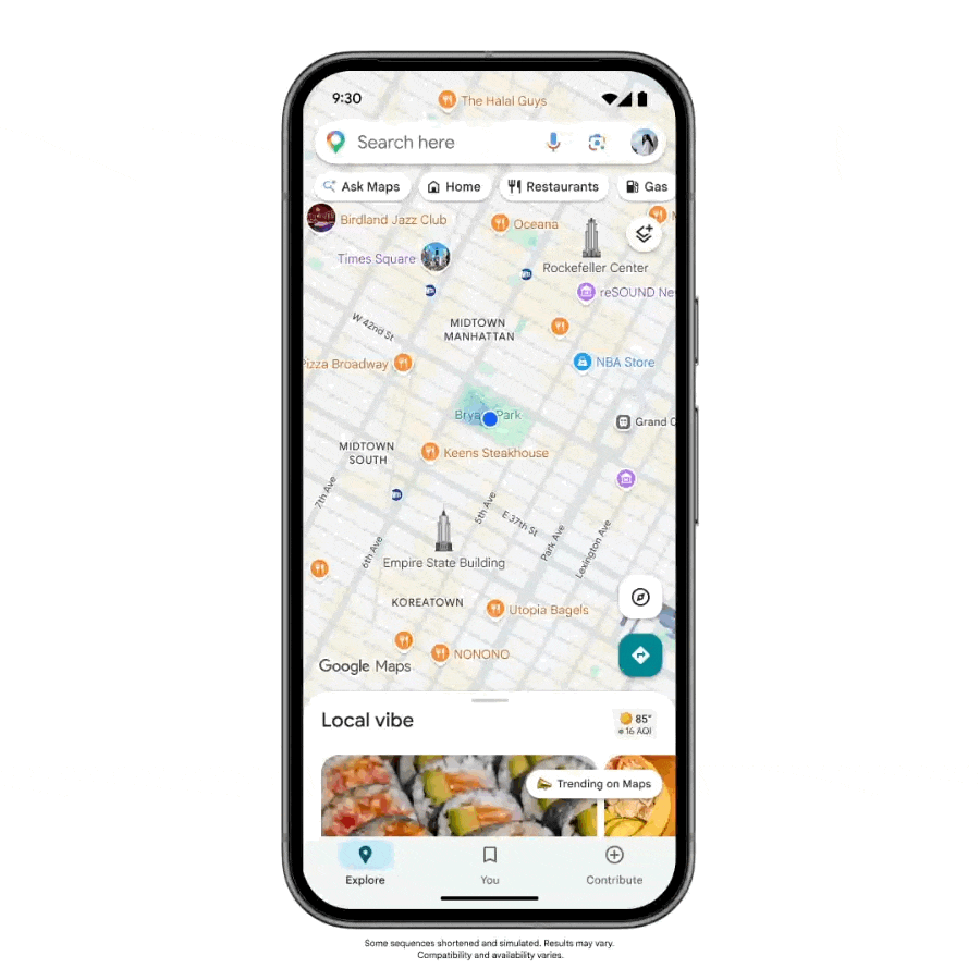 Toque em Pergunte ao Maps para que o Gemini AI crie uma rota para você com base em informações de mais de 300 milhões de locais, incluindo avaliações de uma comunidade de mais de 500 milhões de colaboradores.