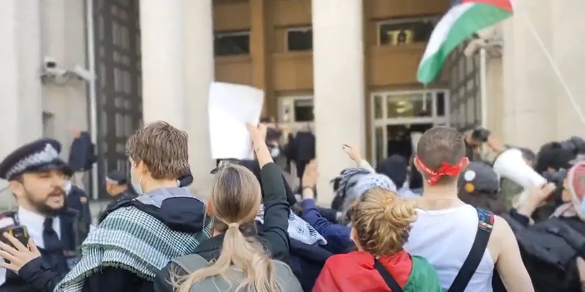 Manifestantes agitando bandeiras palestinas invadiram o prédio do Ministério da Defesa em Londres.