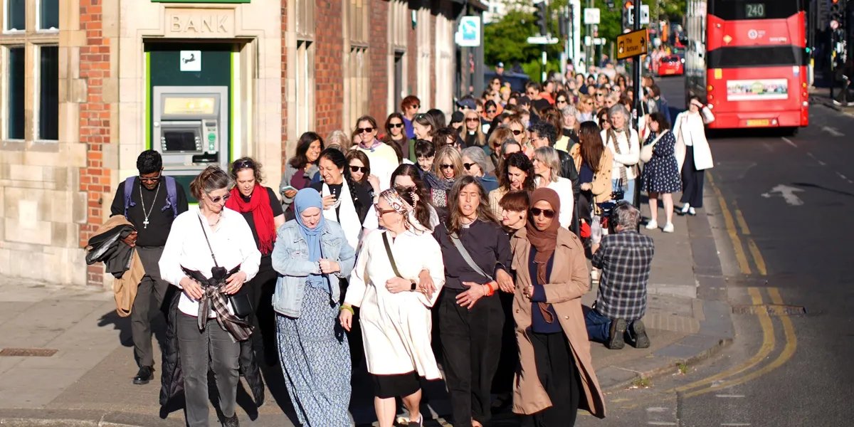 Rev.ª Dra. Catriona LaingA Reverenda Dra. Catriona Laing participa de uma caminhada pacífica de mulheres por Golders Green | PA