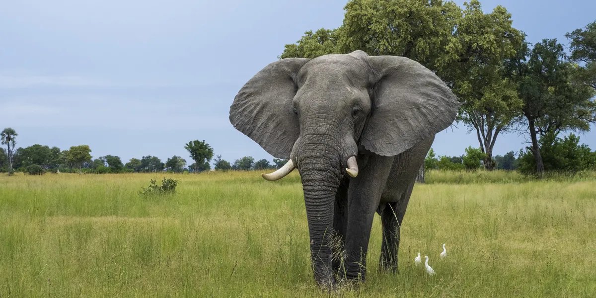 Durante o passeio, o guia observou à distância uma elefanta com seu parceiro mais novo, e os dois animais pareciam calmos.